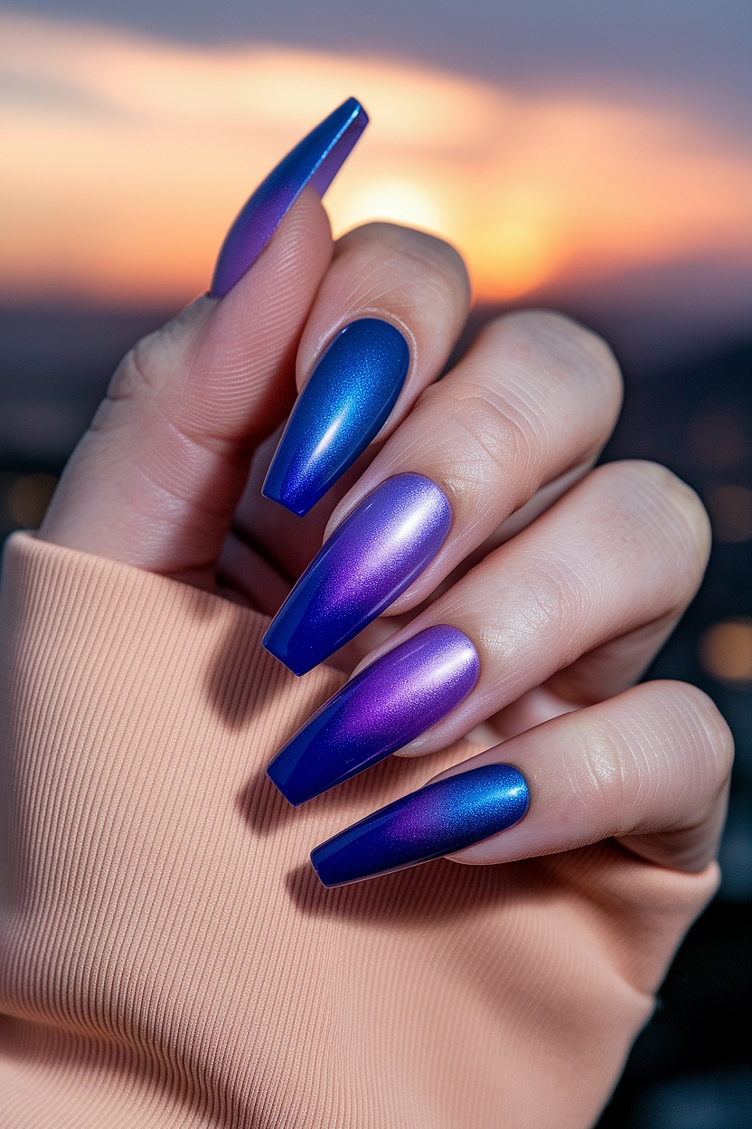 Blue and purple ombre nails create a stunning gradient effect that resembles twilight skies. This dreamy color transition looks like it’s straight out of a fairy tale. The blend of these two cool tones creates depth and dimension that’s truly eye-catching.