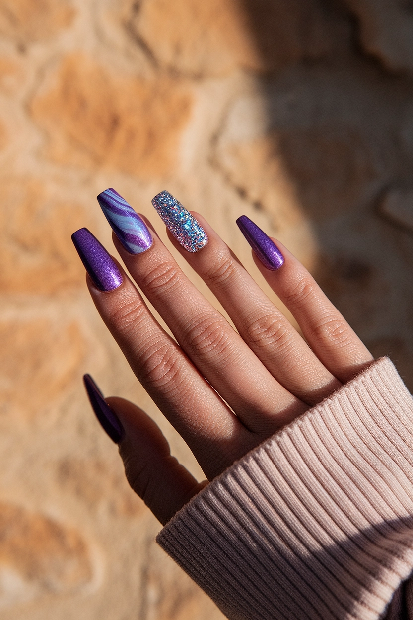 Purple inspired nails take cues from all things purple—from lavender fields to galaxy swirls. These designs use purple as a jumping-off point for creative expression. Let your imagination run wild with different techniques and complementary colors.
