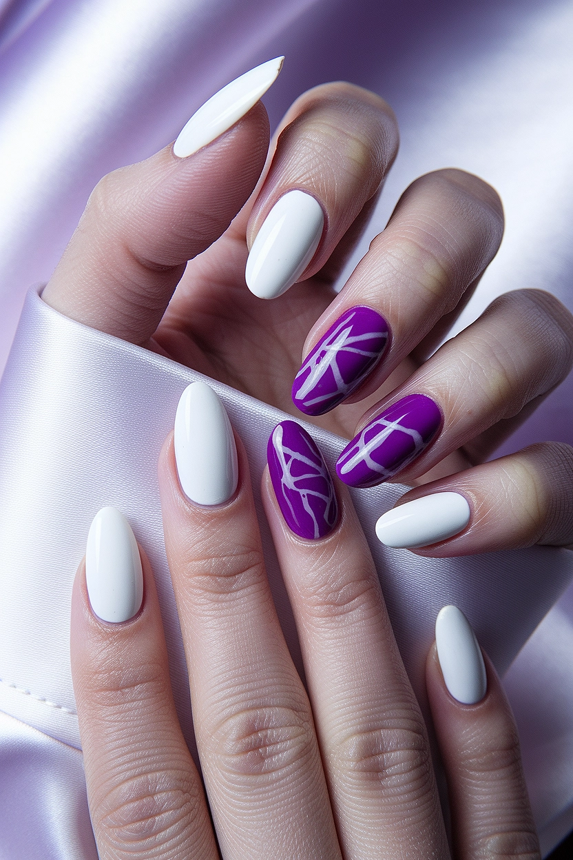 These striking nails pair rich purple with crisp white in an almond shape for maximum impact. The color contrast creates a bold, graphic look that’s both modern and eye-catching. Perfect for those who love to make a statement with their manicure.