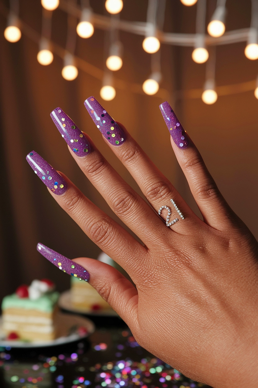 Make your birthday special with these festive purple nails that often include fun elements like confetti, tiny candles, or “happy birthday” script. The purple base sets a party mood while the details make them uniquely celebratory. These nails are the perfect accessory for your birthday outfit.