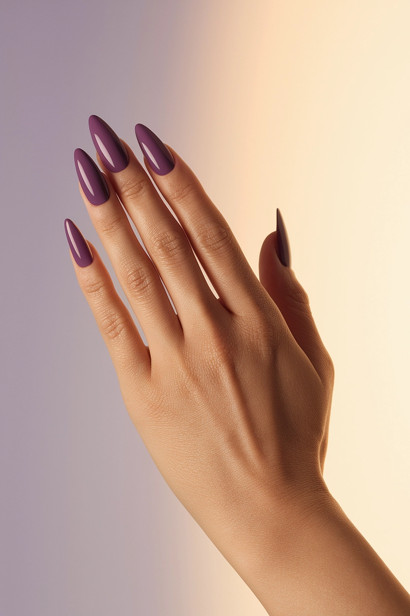 The popular almond shape paired with purple polish creates a sleek, elongating effect for your fingers. This elegant shape tapers gently toward the tip, adding sophistication to the rich purple color. These nails combine classic shape with royal color for a truly timeless look.