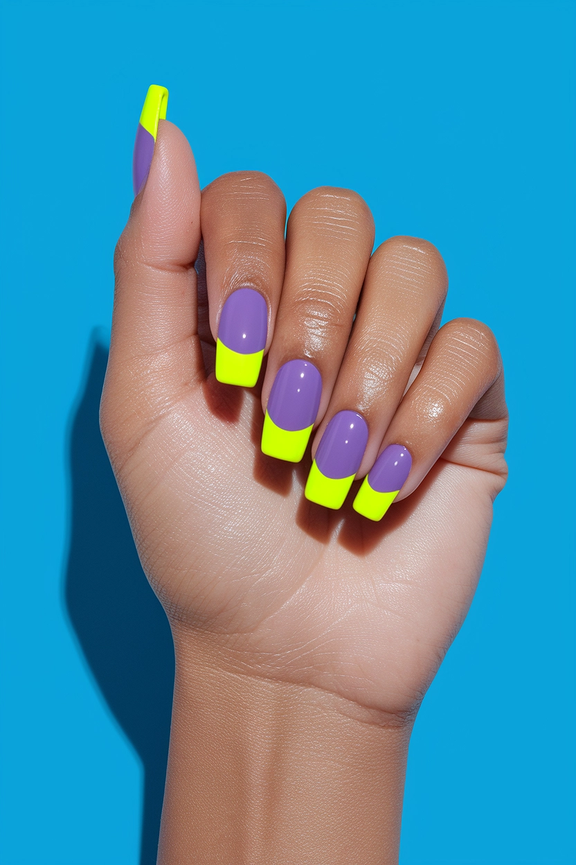 This fun design features a purple base with bright yellow tips for a fresh, modern look. The contrasting colors create a playful vibe that’s perfect for summer or brightening up dreary winter days. This unexpected color combination shows off your creative style and willingness to try something different.